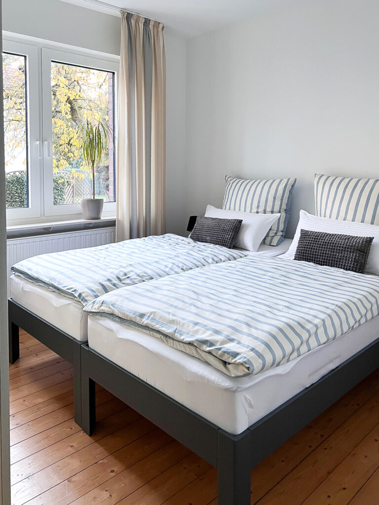 Die frisch renovierte Wohnung im Erdgeschoss eines Zweifamilienhauses bietet eine voll ausgestattete moderne Küche, ein gemütliches Wohn- Esszimmer, ein modernes Bad mit Dusche/Fön sowie ein separates Schlafzimmer, welches mit einem Doppelbett ausgestattet ist. Das Doppelbett kann auch in zwei Einzelbetten umgewandelt werden. Die Wohnung ist ideal für Paare, Alleinreisende, Radler, Geschäftsreisende und Kulturinteressierte. Sie verfügt über einen separaten Eingang vom Garten aus. Aus allen Fenstern haben Sie einen Blick ins Grüne.